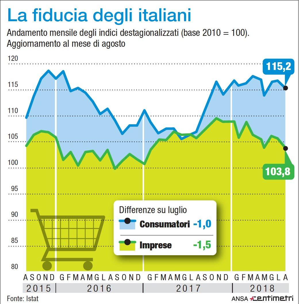 Peggiora ad agosto il clima di fiducia di famiglie e imprese. Secondo le rilevazioni dell'Istat l'indice che misura la fiducia dei consumatori è sceso da 116,2 di luglio a 115,2; mentre l'indice composito del clima di fiducia delle imprese è passato da 105,3 a 103,8. La flessione è dovuta principalmente al deterioramento della componente economica (da 141,3 a 136,6), mentre quella personale aumenta per il secondo mese consecutivo passando da 107,8 a 108,5.