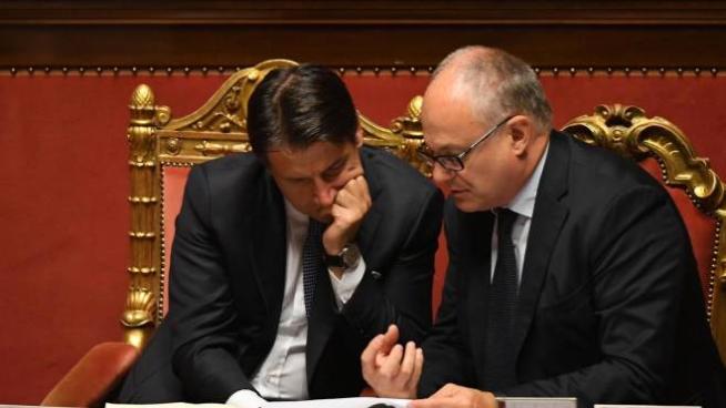 Premier Giuseppe Conte talks with Economy minister Roberto Gualtieri in the Senate ahead of a confidence vote, Rome, 10 september 2019. Italian Premier Conte's new government on the day faced the second of two confidence votes in parliament -- in the Senate, after passing the first one in the Lower House a day earlier. His new government is a coalition between the anti-establishment 5-Star Movement (M5S) and the center-left Democratic Party (PD). ANSA/MAURIZIO BRAMBATTI